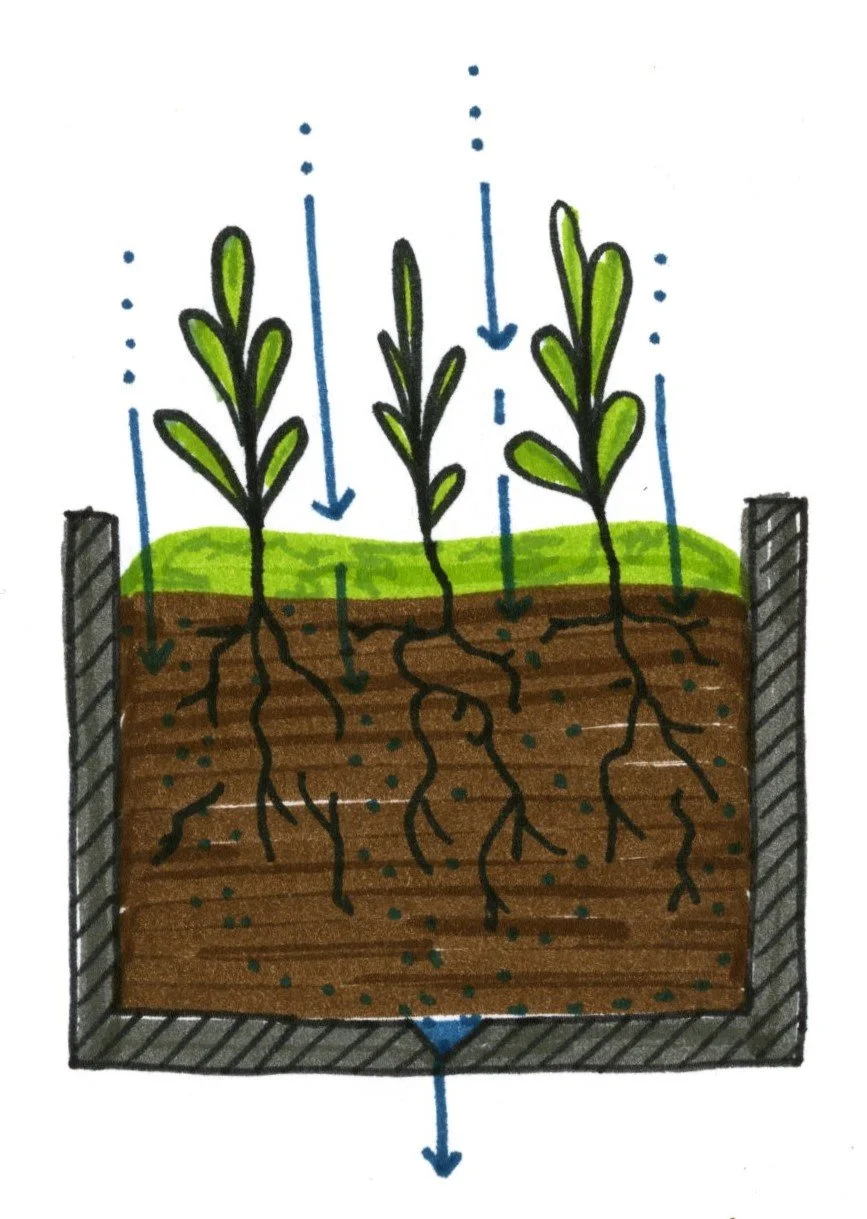 Modular wall system consists of trapezoidal garden beds that operate as scuppers and guide excess water through the gardening system. This system creates usable space, a green roof/wall, collects water, and retains heat through thermal mass.