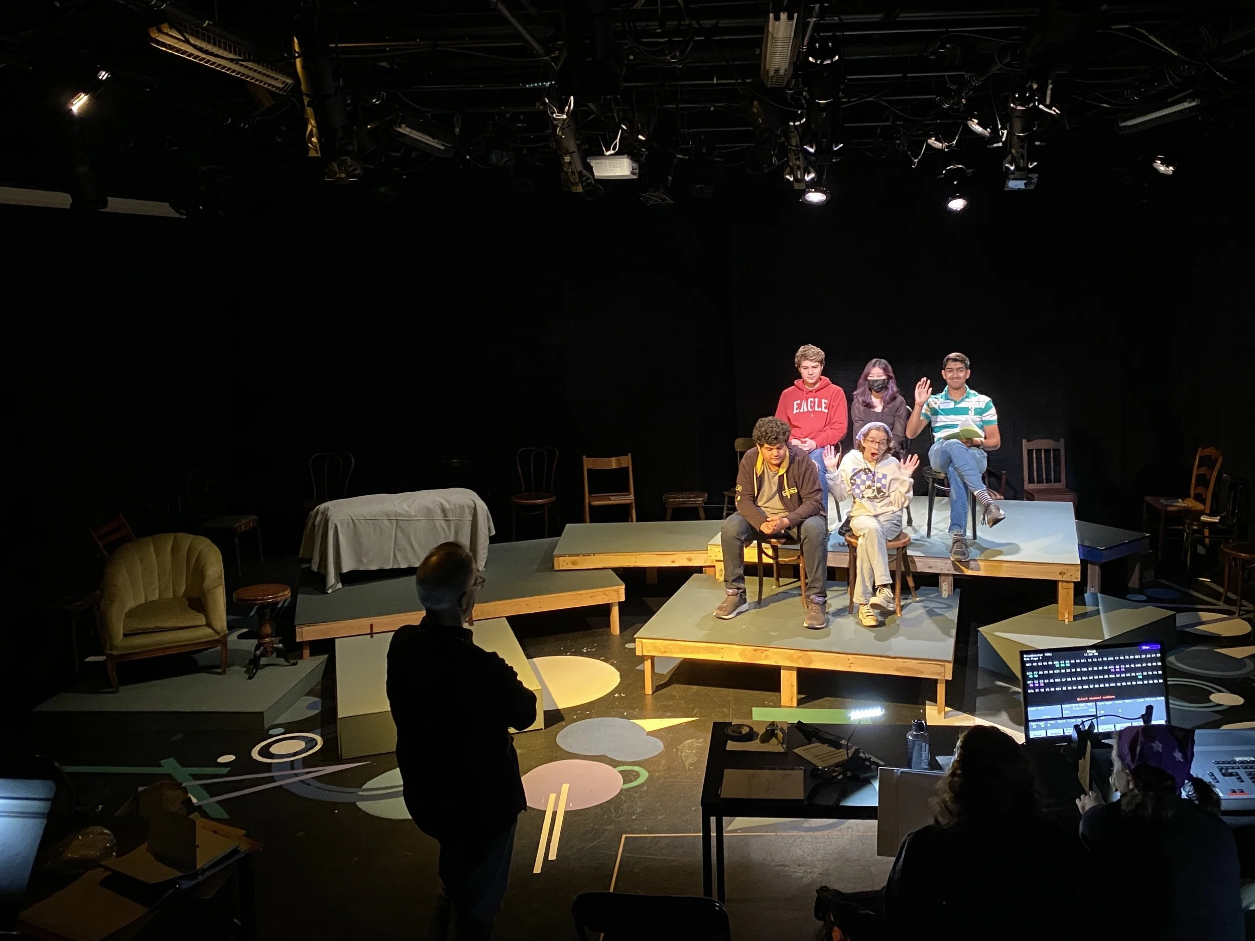 Designed and constructed during the Applied Design and Technical Theatre class for the Horace Mann Theatre Department’s 2022 fall production, the scenic design for The Good Doctor fit in a small space while accommodating 19 actors on stage and providing dynamic space for various vignettes. The main feature of this design is a set of overlaying platforms. The play revolves around a lonely writer and his scattered memories, and the disorderly nature of the platforms represents the pieces of his life fusing to form the play itself.